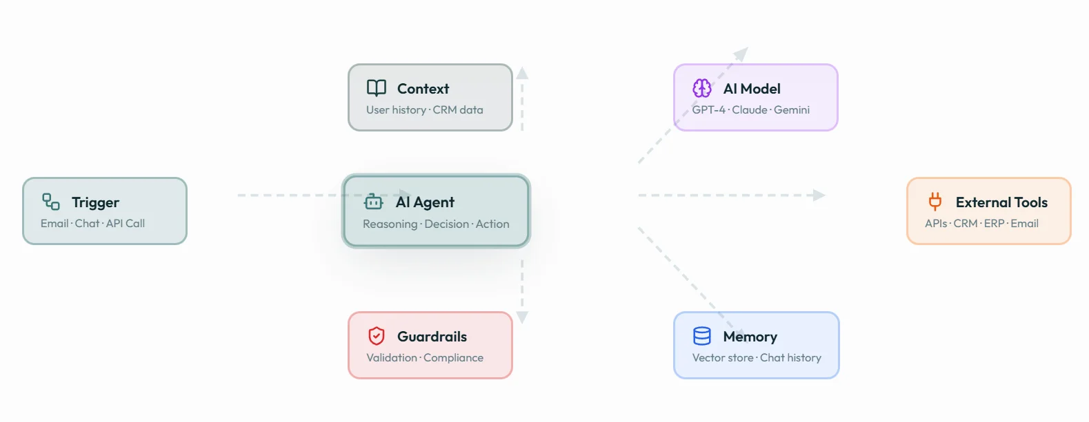 Our AI agents sit at the centre of a powerful workflow—reasoning, acting, and connecting to the tools your business already uses.